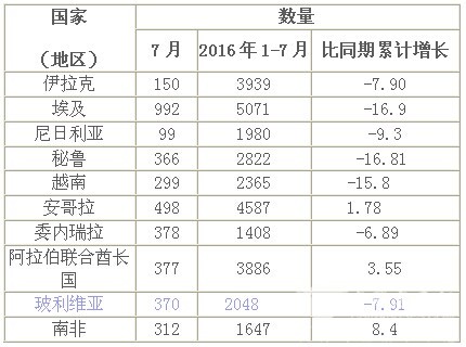 上图表表明:2016年1-7月出口国家中,安哥拉数量最多,南非增幅最大。出口前10个国家中,大部分出口数量同比都是下降的,这也是导致1-7月客车出口市场萎靡不振的重要因素之一。