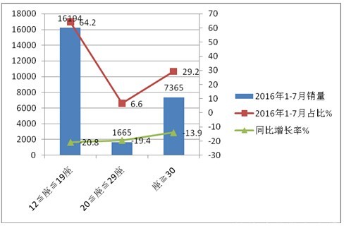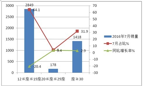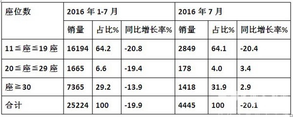 2)按座位数划分分析2016年7月及1-7月客车出口结构