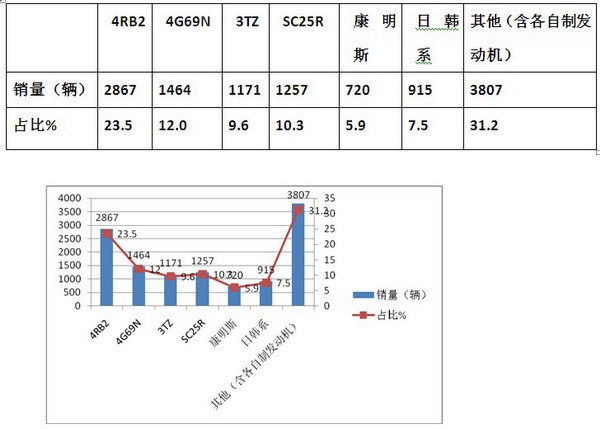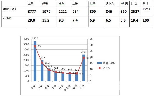 从上图表看出:轻客品牌的轻型客车-- 绵阳4RB2汽油机占据的权重最大,其次是三菱发动机4G69N汽油机,再次是五菱柳州机器发动机;总体看汽油机占据主体地位,柴油机器主要以上柴SC25R和康明斯为主。