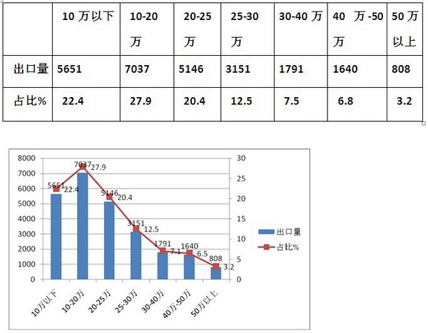 上图表表明,2016年1-7月客车出口量在10万以上的价格中,基本规律是:价格越高,出口量越小。即出口量与价格成反比。从此也可以看出,目前我国出口海外的客车基本上是价格在30万以下(80%以上)的中低档次车型。