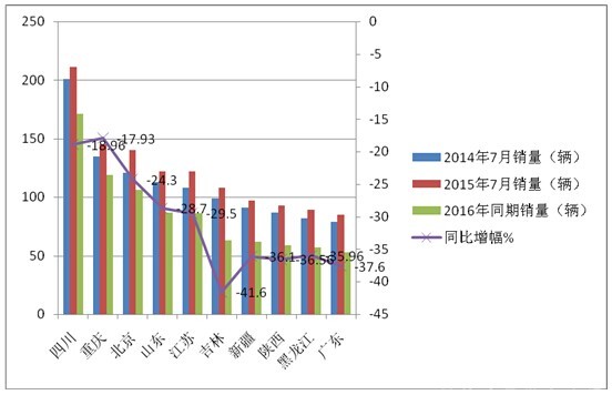6、2016年7月与2015年7月同比,10个重点市场CNG客车销量均有不同程度的下降。