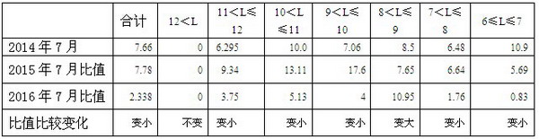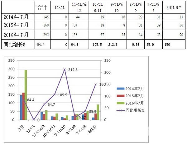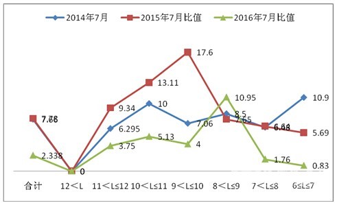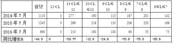 2016年7月按大中轻车型划分CNG客车销量结构增幅统计及与前两年同期比较表: