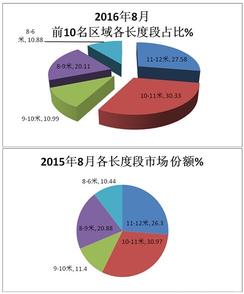 5、按长度段来分析,销量前10名区域市场近3年8月份在各长度段的销售比例如下图: