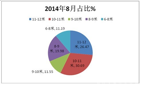 2、近3年的8月份,11-12米销量比例始终是次大的,占据团体客车的市场比例均接近或超出25%,2016年8月最大,2014年8月次大。