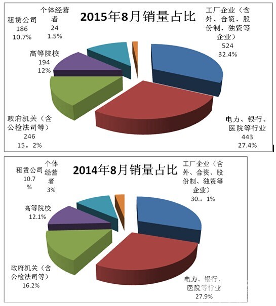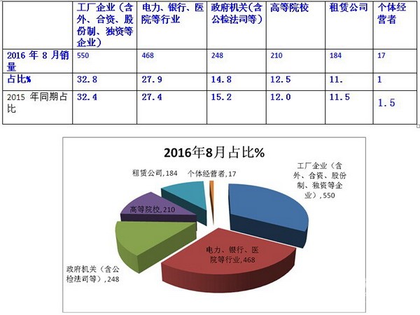 1、2016年8月份按目标客户所在行业细分,可以看出工厂企业(含外资、合资、股份制、独资等)购买的团体客车数量最多,且同比权重上升;进一步调研可知,这些企业购买团体客车主要用途是为了接送职工上下班,其次是用于接待客人等。
