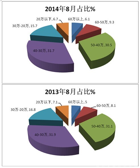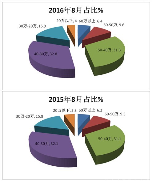 4、30万-20万的价格区间的团体客车占比与2015年同期比基本持平。与2014年8月比较也是同样的情况。