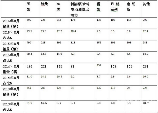 2、潍柴发动机是2016年8月团体客车销量中权重次大的细分市场,几乎占据了8月团体客车市场销量的六分之一到七分之一,但与2015年8月级2014年8月比,权重也在呈现逐年下降态势。
