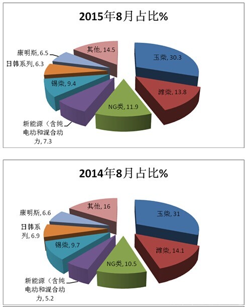 3、NG类(含CNG和LNG)发动机是2015年8月团体客车销量中权重第三大的细分市场,几乎占据了8月团体客车市场销量的十分之一强,但与2015年8月和2014年8月比较,权重在逐年提高,说明团体客车市场中也越来越重视环保和节能经济成本了。