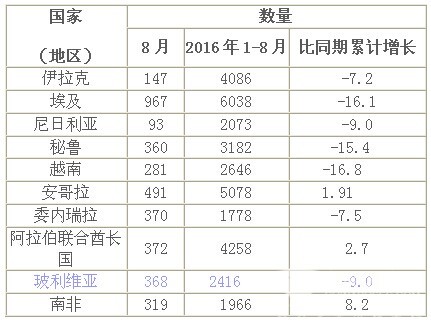上图表表明:2016年8月客车出口国家中,埃及最多,1-8月出口国家中,埃及数量最多,南非增幅最大,出口前10个国家中,大部分出口数量同比都是下降的,这也是导致1-8月客车出口市场萎靡不振的重要因素之一。