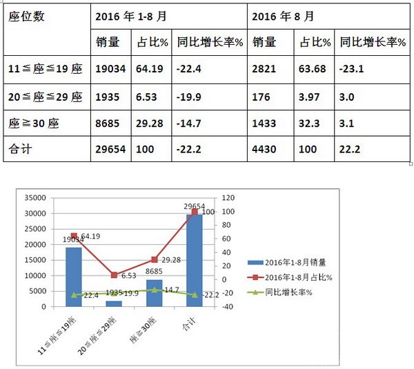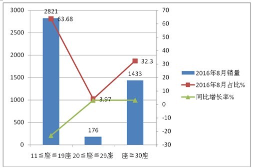 2)按座位数划分分析2016年8月及1-8月客车出口结构