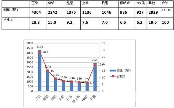 根据海关数据统计,2016年1-8月各类轻型客车出口大约14709辆,按发动机品牌划分销量结构分析如下表: