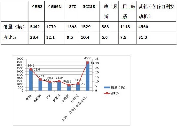 从上图表看出:轻客品牌的轻型客车-- 绵阳4RB2汽油机占据的权重最大,其次是三菱发动机4G69N汽油机,再次是五菱柳州机器发动机;总体看汽油机占据主体地位,柴油机器主要以上柴SC25R和康明斯为主。