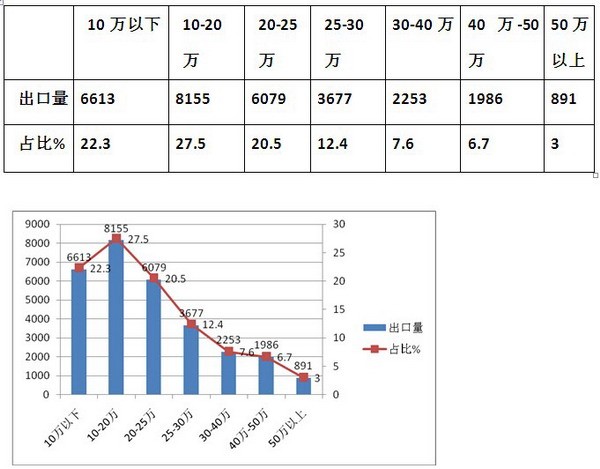 上图表表明,2016年1-8月客车出口量在10万以上的价格中,基本规律是:价格越高,出口量越小。即出口量与价格成反比。从此也可以看出,目前我国出口海外的客车基本上是价格在30万以下(80%以上)的中低档次车型。