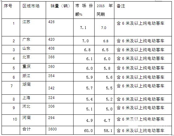 根据最新上牌信息,2016年8月纯电动客车销量前15名区域市场集中度统计: