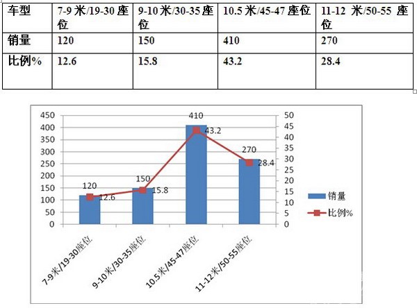 根据市场调研,2016年1-8月,江苏市场共计购买的大中型团体车数量为950辆,用车市场需求车型以10.5米/45-47座位为主, 12米的大客车也有,但比例要少些,因为成本太高.这主要因为团体一般工作日用作单位班车,节假日用作旅游包车,较大的容量具有经济相对的经济优势.但是,12米大车在购买时投入的成本可能要比10.5米的客车要多出8-10万,成本收回的时间比较长,风险比较大,不太划算.,较小车型又不能满足单位用车和租赁市场的容量需求,而且回报率也比较低,因此,太大和太小的车型对江苏的团体市场来说均不太合适。