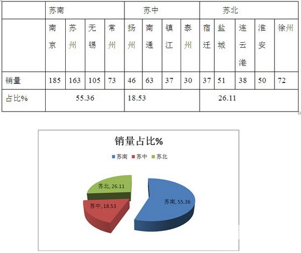 2、从上分析可知,2016年1-8月江苏市场团体客车销售流向分布不均,苏南最多,其次苏北,再次是苏中。