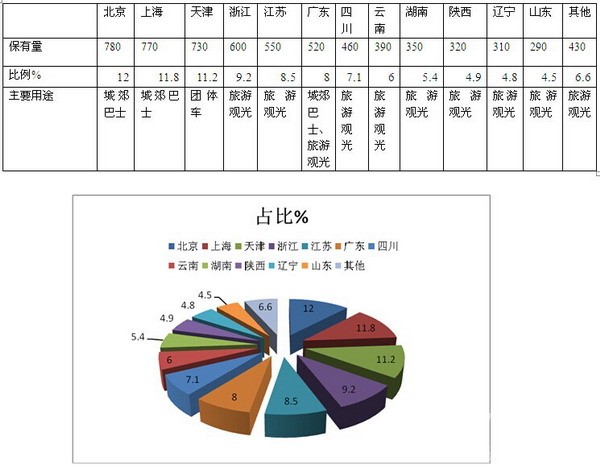 根据专家调研,目前每年中国客车市场对MPB客车的需求量大约在1000多辆左右,约占每年大中型客车市场需求0.6-0.7%的比例.MPB团体客车主要运行在运距为30-80公里的大中城市的厂矿企业之间,或大城市的卫星城到主城区之间,目前的目标市场主要集中在浙江、江苏、上海、北京、天津等经济发达的地区。具体的说,MPB旅游客车主要是运行于大城市到郊县的旅游景点之间,运距大约在30-100公里之间。目标市场主要集中在江苏、云南、辽宁、陕西、北京、四川等具有丰富旅游景点的地区;MPB城市客车巴士主要运行在大城市的主要干线路和城郊线路,运距一般在50-100公里,目标市场主要集中在北京、上海等大城市。