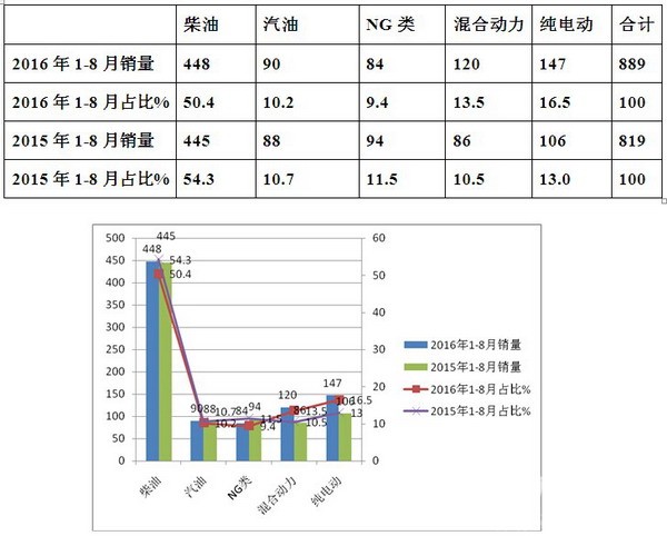 上图表表明,2016年1-8月同比,柴油下降,NG类下降,混合动力及纯电动上升幅度较大。