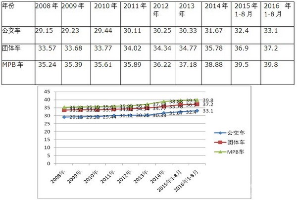根据有关统计数据获悉(以10米5长度的车型为例来说明),一辆10米5左右的MPB的平均价格一般要比同类型的公交车平均价格要高出6万元左右,比同类型的团体车要高出2万元左右。下表是(以10米5车型为例)统计的2006-2016年1-8月近8年来的MPB、公交车、团体车的平均价(单位:万元)格比较: