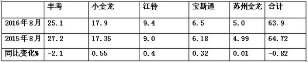 2016年8月份小金龙考斯特车型单月销售249台,同比增长6.87%,是国产考斯特品牌中销量最大的企业