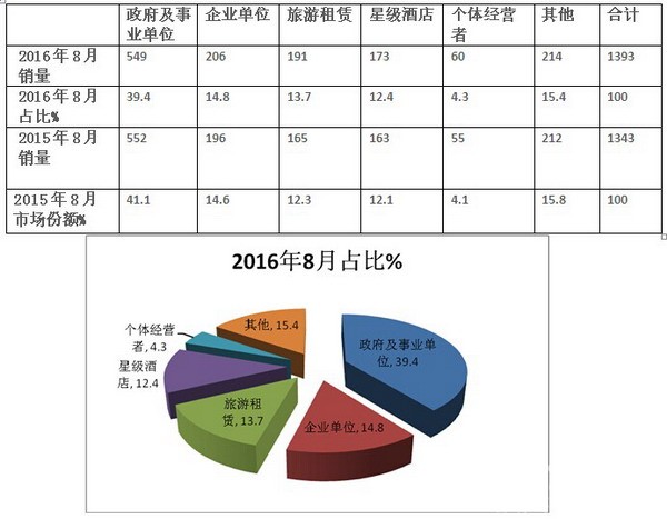 5、个体经营者购买60辆,占比为4.3%(2015年8月份此细分市场销量是55辆,占有率为4.1%),同比提高了0.2个百分点。
