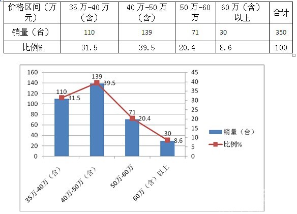 从上分析可以看出:丰田柯斯达价格在40-50万之间的产品销量比例最大,其次是30-40万的价格区间;60万以上的高档销售比例最小。