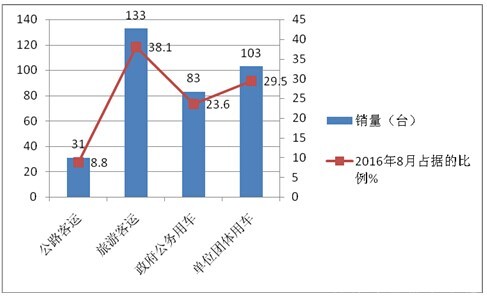 2016年8月份,国产品牌中最大销量的小金龙考斯特,主要细分市场用于旅游客运领域,其次是公路(公交)客运领域,再次是单位团体客车领域,政府公务用车领域为最少,主要原因是三公费用得到了限制,公款旅游市场受到了制约。