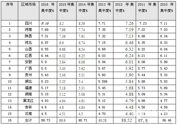 3、前15名销量区域市场集中度从2010年的86.46%逐年提高到2014年的90.71%,又稍微降低到2016年的89.73%,
