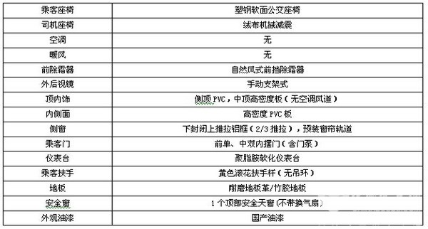 前风挡除霜系统,电动折叠乘客门,杆式倒车镜,铝框推拉侧窗,后行李仓,简易内饰(无成型内饰顶),单体式内顶灯,普通地板革,高靠背司机椅(前后可调式),普通方头乘客座椅(靠背不可调,不可横移,无扶手),2+1布置,不锈钢护栏,收音机,内后视镜,电子钟,实色漆。