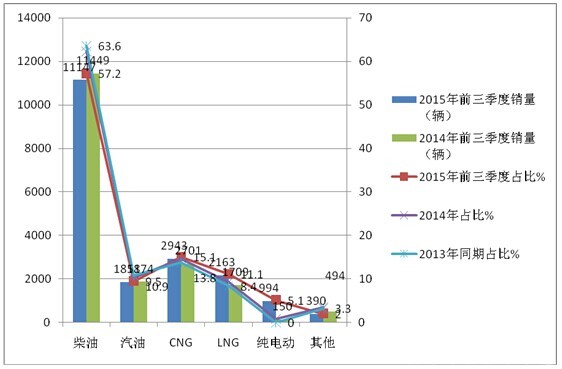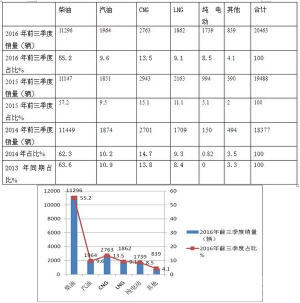 1、2016年1-9月,农村客运市场中销量最大的是柴油,其次为CNG、再次是汽油,第四是LNG,第五是纯电动;柴油仍然占据农村客运市场中占据绝对大的市场份额,但近四年呈现逐年下降态势。