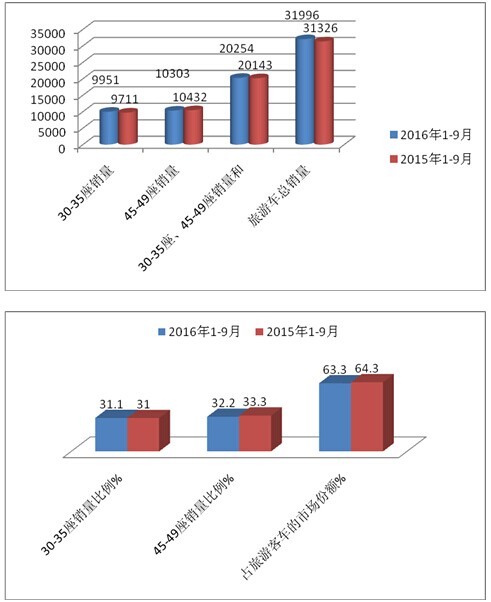 根据对目标用户的调查,旅游团分为大团和小团,一般大团在47人左右,小团在33人左右,所以,旅游客车主要集中在10-11米、11-12米、8-9米和7-8米等长度段上, 2016年1-9月旅游车30—35座与45-47座位销量、比例情况与2015年同期比情况如下表(表1):