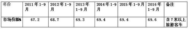 三龙二通(含宇通、中通、大金龙、苏龙、小金龙)、浙江青年、安凯客车等7家重点旅游客车企业近5年1-9月旅游客车销售市场占有率统计表(表3)