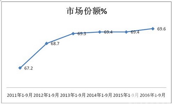 从上图表可以看出:三龙两通及青年、安凯等7家主流企业的旅游客车的市场占有率从2011年前三季度的67.2%逐年升高到2016年前三季度的69.6%,说明在客车行业旅游客车市场的客户一方面越来越注重品牌,另外一方面,旅游客车市场的垄断程度越来越高,而且有加大的发展态势,但这种步伐的速度减弱(2014年1-9月集中度与2015年1-9月集中度均为69.4%,持平)留给其他客车企业的旅游市场机会越来越少。出现上述现象的主要原因分析: