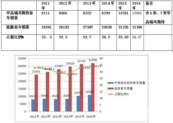 从上述图表可以看出,近6年前三季度中高端考斯特客车销量占据当年前4季度旅游客车的比例从2011年的33.3%逐渐下滑到2014年的28.3%,但到2015年前三季度又出现拐点升高到33.03%,2016年升高到34.27%,主要原因是: