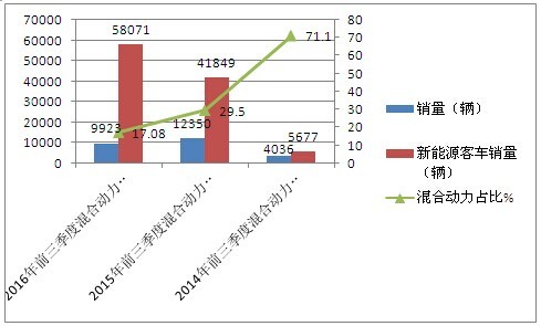 上述统计数据表明,混合动力客车销量在新能源客车总体销量中的占比正在逐年下降,近三年从2013年的71.1%逐年下降到2016年的17.08%。