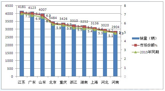 根据最新上牌数据,统计计算,2016年前三季度各重点区域销售新能源客车及占据份额%表: