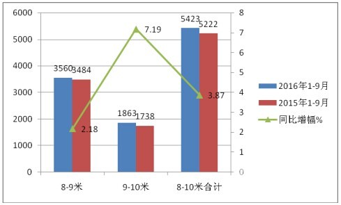 二、华东市场2016年1-9月8-10米座位客车销量与近两年同期比较分析---8-9米销量大于9-10米,但9-10米增幅大于8-9米增幅