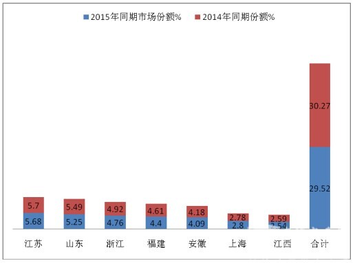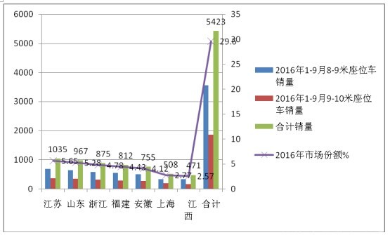 1、2016年1-9月8~9米和9-10米座位车在上述7个区域市场共计销售5423辆,占据据8~9和9-10米座位车总销量的29.6%,其中8-9米占据了整体8-9米市场29.08%的市场份额,9-10米占据30.64%的市场份额。说明在华东地区,9-10米市场竞争更激烈,而9-10米则相对宽松些。从8-10米销量看,只有江苏超出1000辆。