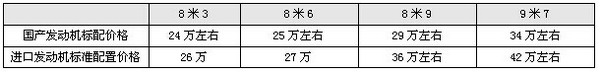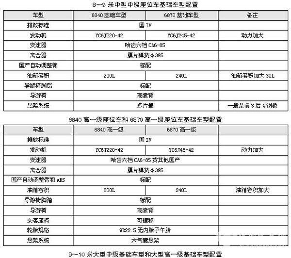 根据市场调研,在华东区域销售的8~9米和9~10米座位车车型销售中,国产配置分别占据到近90%和80%的市场份额,且主要以中级车和高一级车为主。其中中级车型分别占据到60%及55%左右,高一级占据到40%及45%左右。因此,下面以国产配置和中级及高一级车型配置来分析(以配置最广泛的玉柴发动机为例),最能说明问题。