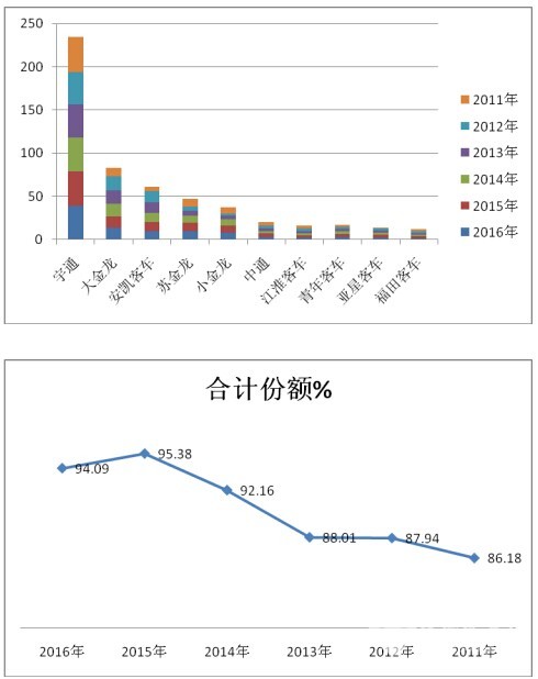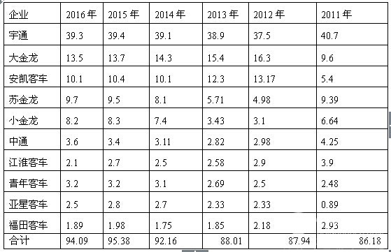 1、宇通是9-10米座位客车的老大,近年一直相对稳定,一直在40%左右徘徊。,