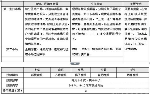 可以把山东、江苏、上海、浙江等确立为8~9米车和9~10米座位车的第一主打市场,把安徽、江西作为第二市场,对不同市场采取不同的策略。采取直销为主、经销为辅的方针。直销可以采取人海战术,多派驻业务人员,直接寻找目标客户,经销可以在重点区域市场寻找经销商,利用当地的资源和渠道来拓展市场。