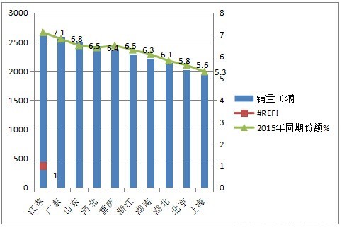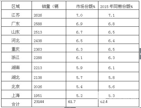 上图表表明,2016年前三季度纯电动公交客车重点流向江苏、广东、山东等10个重点区域市场,前10个重点区域纯电动公交客车的市场占有率为60.7%,同比2015年下降了0.7个百分点,说明重点区域的垄断程度有所减弱。