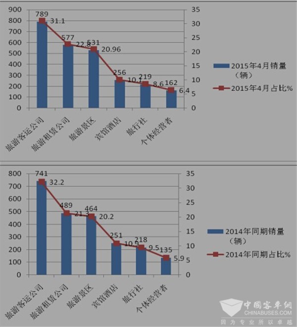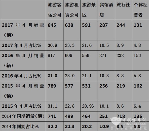 按目标客户行业划分,2017年4月及近3年同期旅游客车销量结构统计表,表1