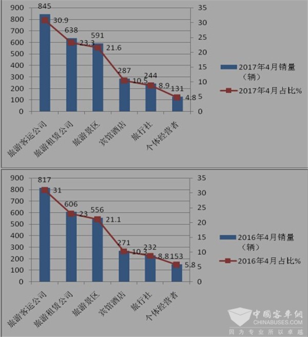 3、旅游景区是2017年4月份购买旅游客车第三大主体,且同比2016年4月也有上升趋势(上升了0.5个百分点),近2年来是呈现上升态势。