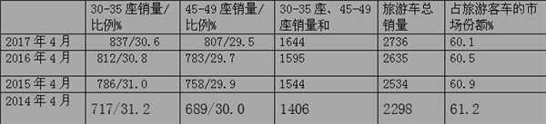 2017年4月及近3年旅游客车同期销量结构统计表,表2