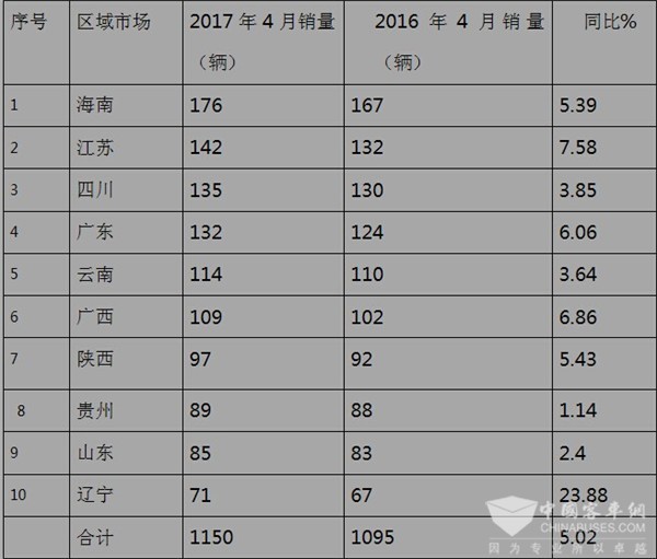 6、从上述分析可知,2017年4月份旅游客车市场的集中度不高,但10个区域销量全部是正增长。