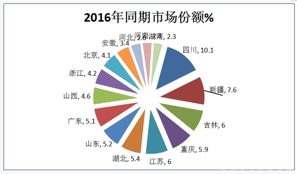 2、前15名主流市场中,河北区域的市场份额增加最大,江苏区域减少最多。其余区域基本持,平变化不大。