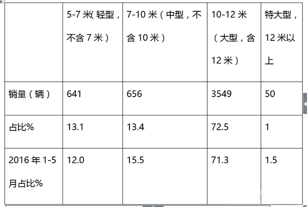 3、轻型客车占比增加的主要原因可能是因为2017年1-5月轻型纯电动客车销量大幅度减少,进而导致轻型天然气类轻型客车增加。