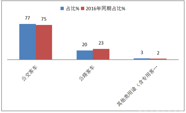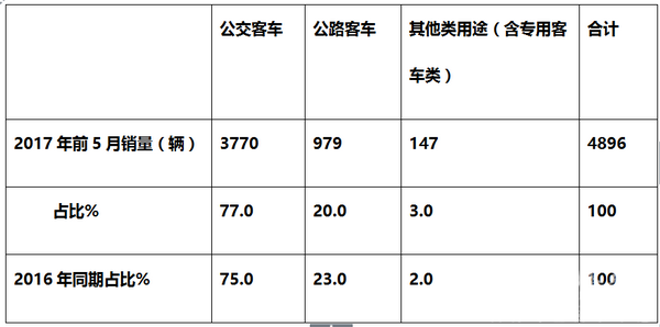 1、公交市场仍然是2017年前5月天然气客车需求最大的细分市场,占比为77%,且同比权重增加了2个百分点。