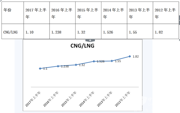 2、近6年上半年CNG客车与LNG客车的销量比值从2012年的1.82逐年下降到2017年的1.10,充分说明近6年的燃气类客车市场在发展过程中,CNG的发展速度相对LNG来说较为缓慢,换句话说,目前燃气类客车产品由CNG客车向LNG客车加速过渡,构成 NG类客车的市场结构比例正在发生改变。原因如下: